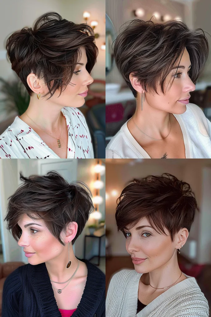 Short choppy layers are used in this pixie cut which makes it appear energetic as well as trendy. It adds movement and texture which gives youthful vibes associated with low maintenance aspects of this style.